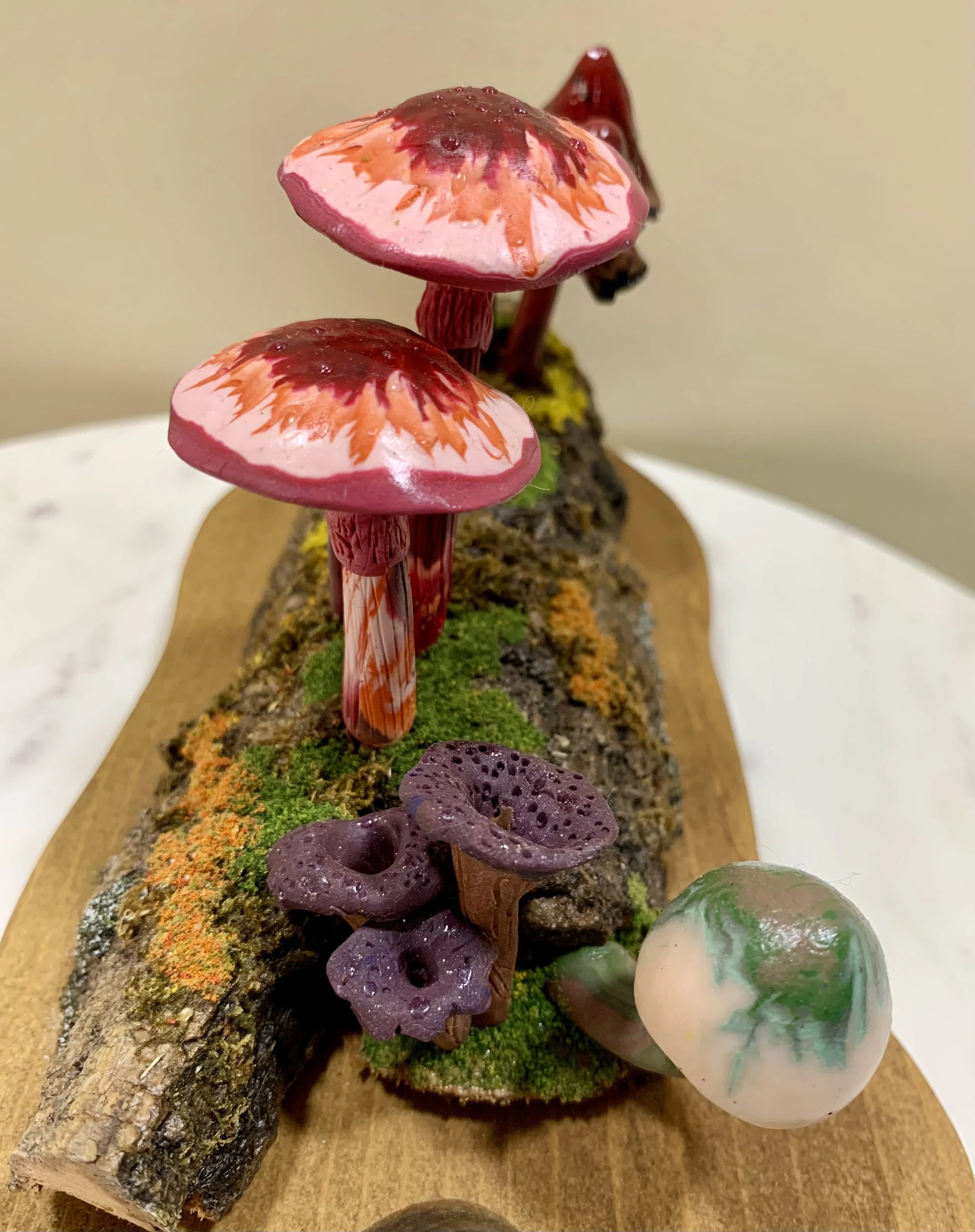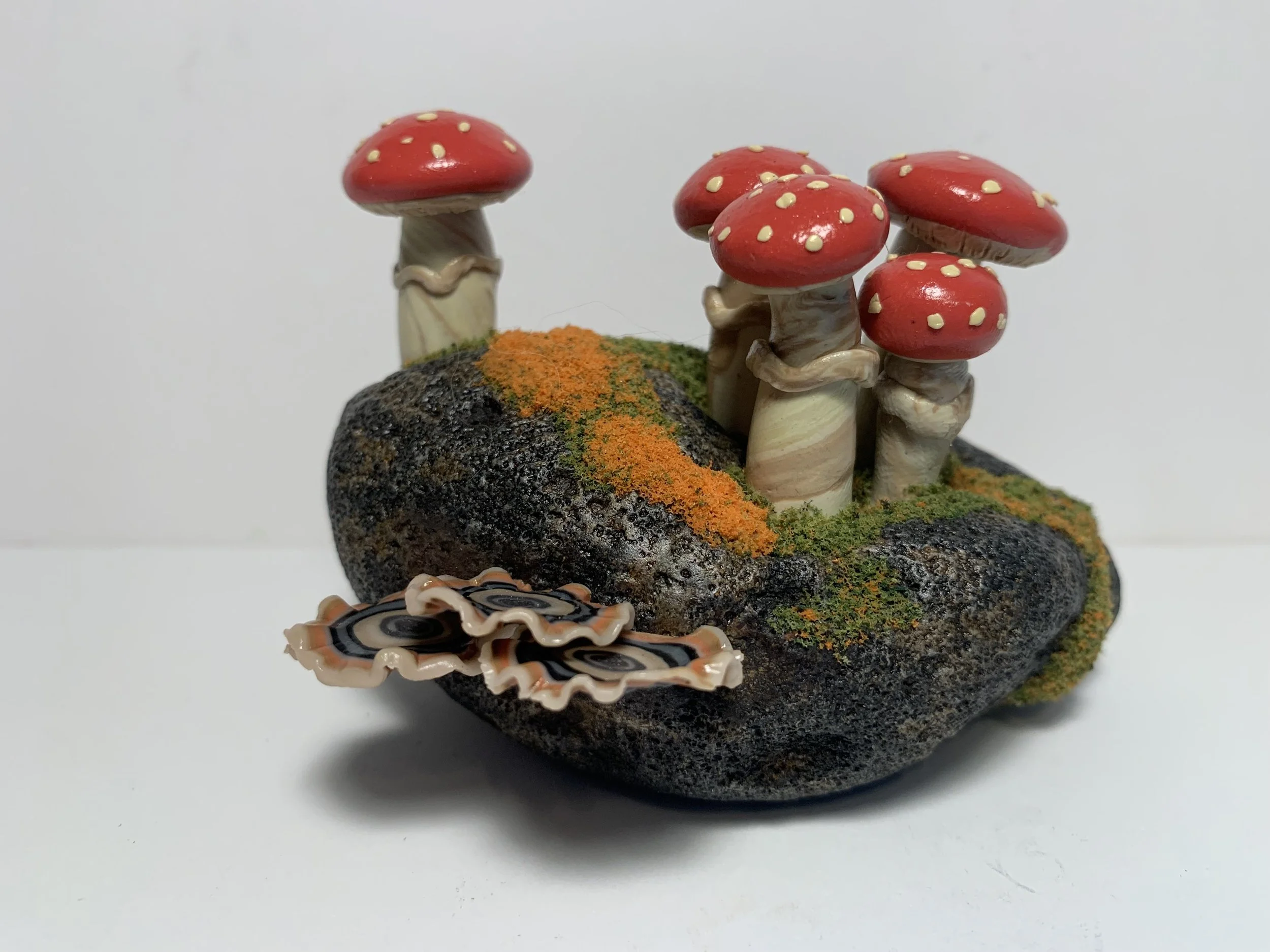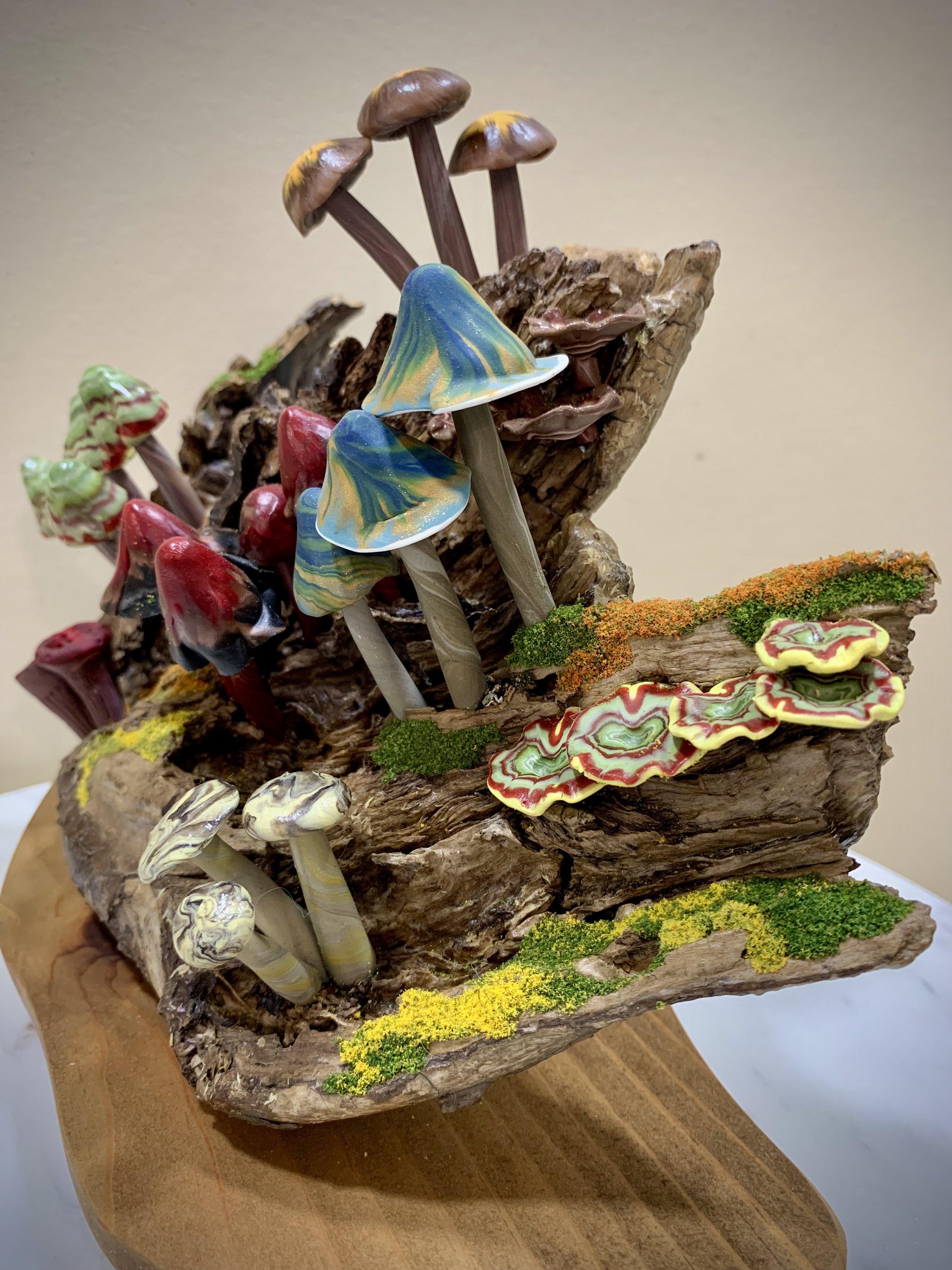 These singular sculptures are meticulously handcrafted in polymer clay and mounted on thoughtfully foraged natural wood. While rooted in the textures and forms of the natural world, each piece is a wholly original creation — imagined, not replicated. Rich in color, detail, and narrative, these mushrooms serve as sculptural studies in organic form and fantastical design. No two are alike, making each a collectible work of art that invites contemplation and curiosity.