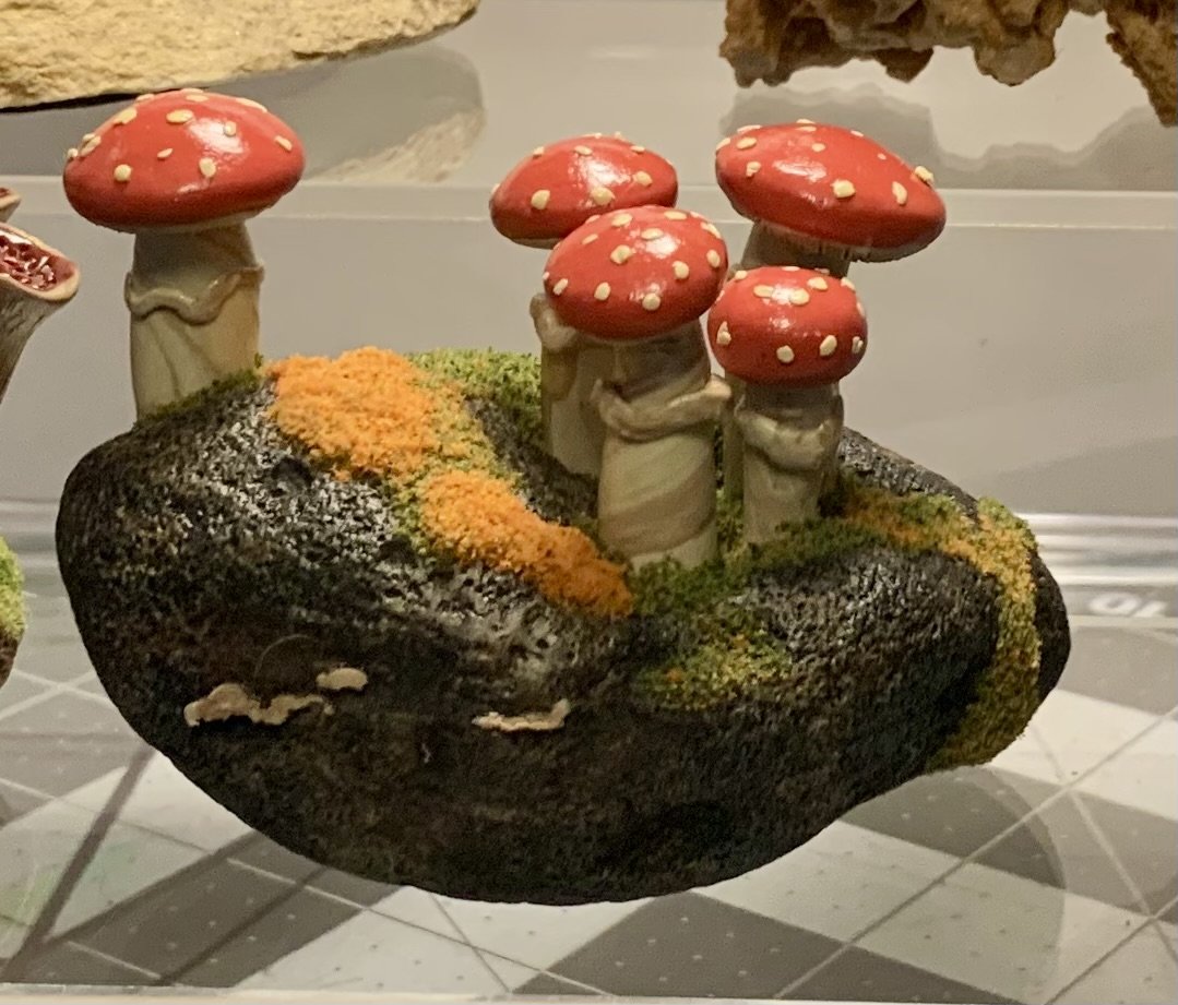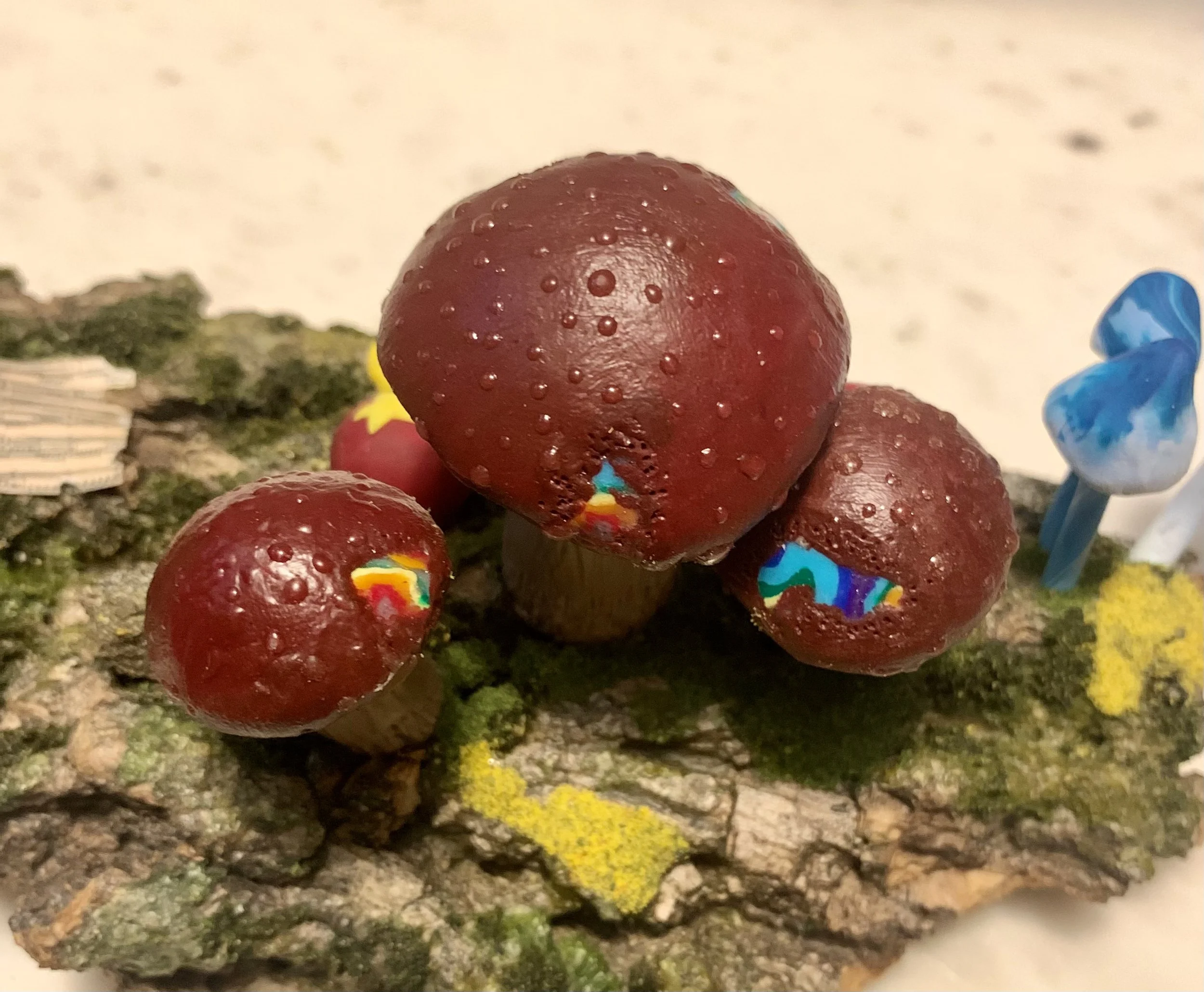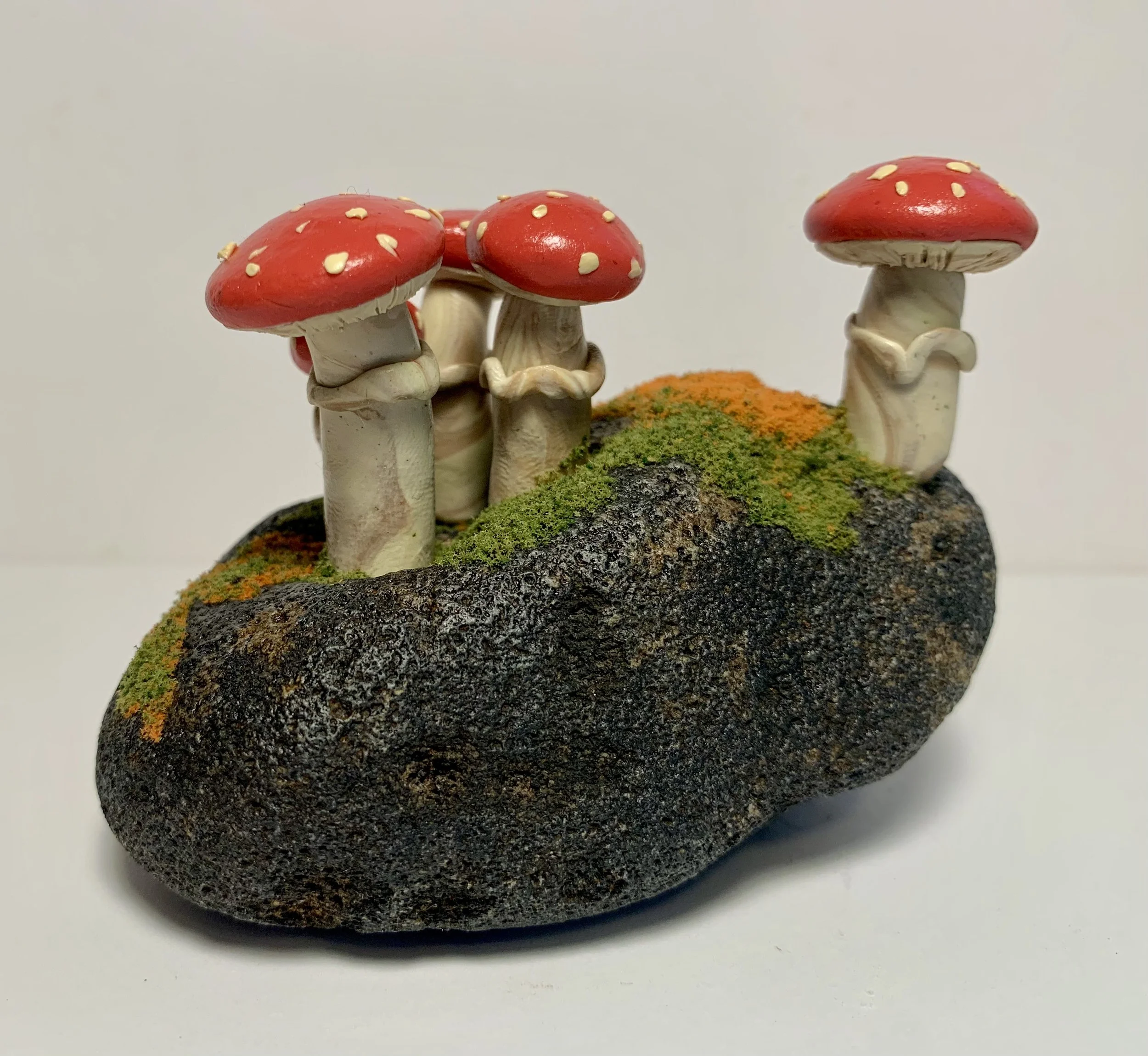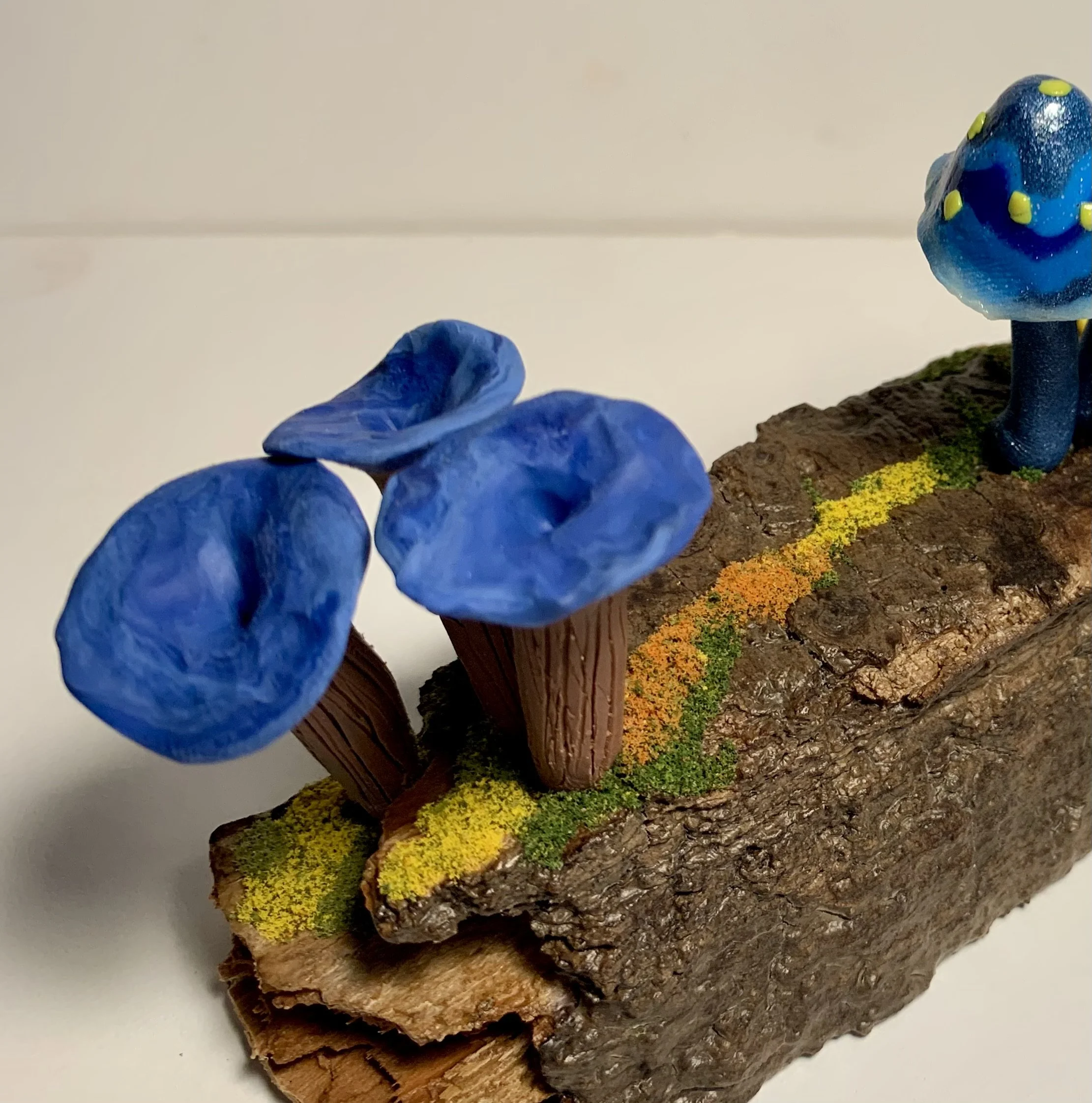 These singular sculptures are meticulously handcrafted in polymer clay and mounted on thoughtfully foraged natural wood. While rooted in the textures and forms of the natural world, each piece is a wholly original creation — imagined, not replicated. Rich in color, detail, and narrative, these mushrooms serve as sculptural studies in organic form and fantastical design. No two are alike, making each a collectible work of art that invites contemplation and curiosity.